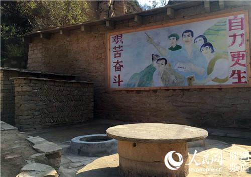 沼气池旁边窑洞的外墙上,是一幅手绘的宣传画。上面写着“自力更生、艰苦奋斗”八个大字。